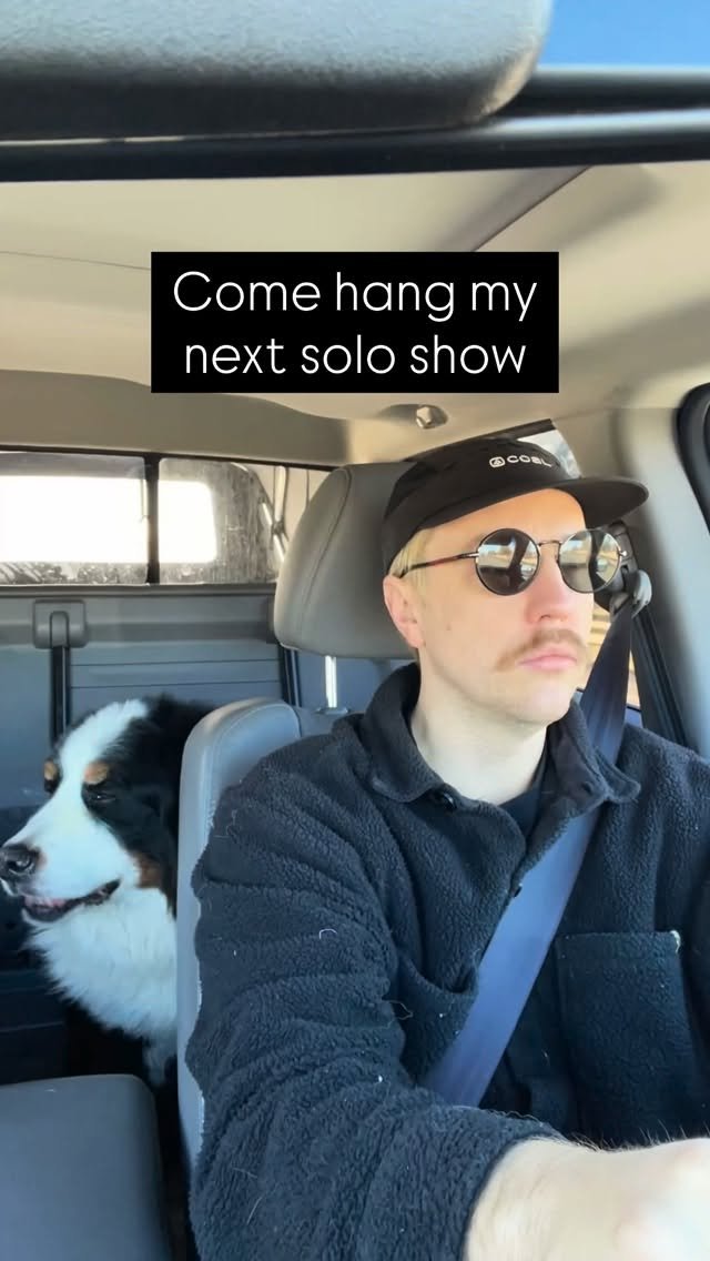 A man with a beard and long hair, wearing a black beanie and dark clothing, is sitting on a folding chair and looking at his phone. There is a large painting of a leaf in the background.