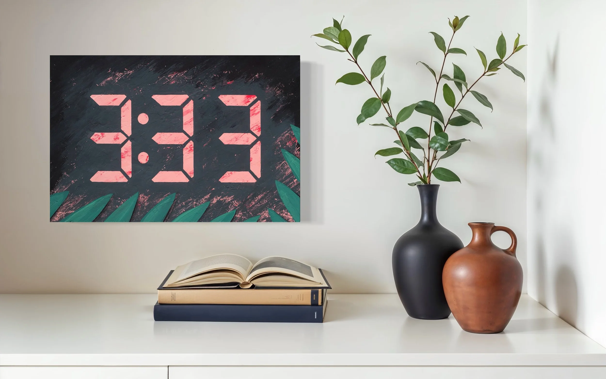My own relationship with time has been plagued by watching the minutes pass during many a sleepless night. The catalyst for these commissions, an original piece titled Bedtime, depicting an alarm clock at 3:33 am, is directly from my experience of insomnia and falling asleep well into the morning hours.